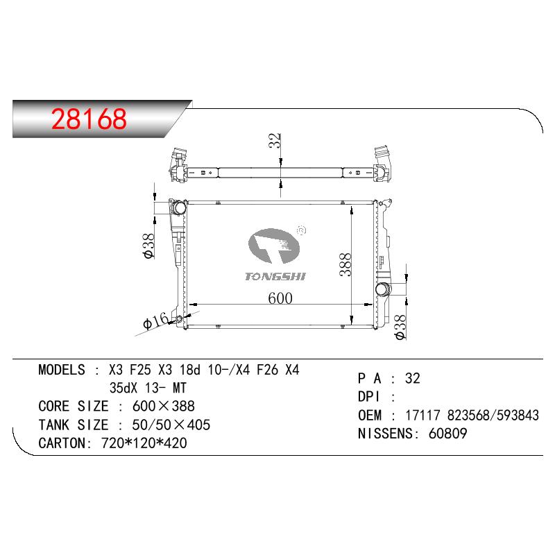 适用于宝马X3 F25 X3 20DX/X4 F26 F26 X4 35DE散热器OEM:17117 823568/17117 593843/17117823568/17117593843/78235