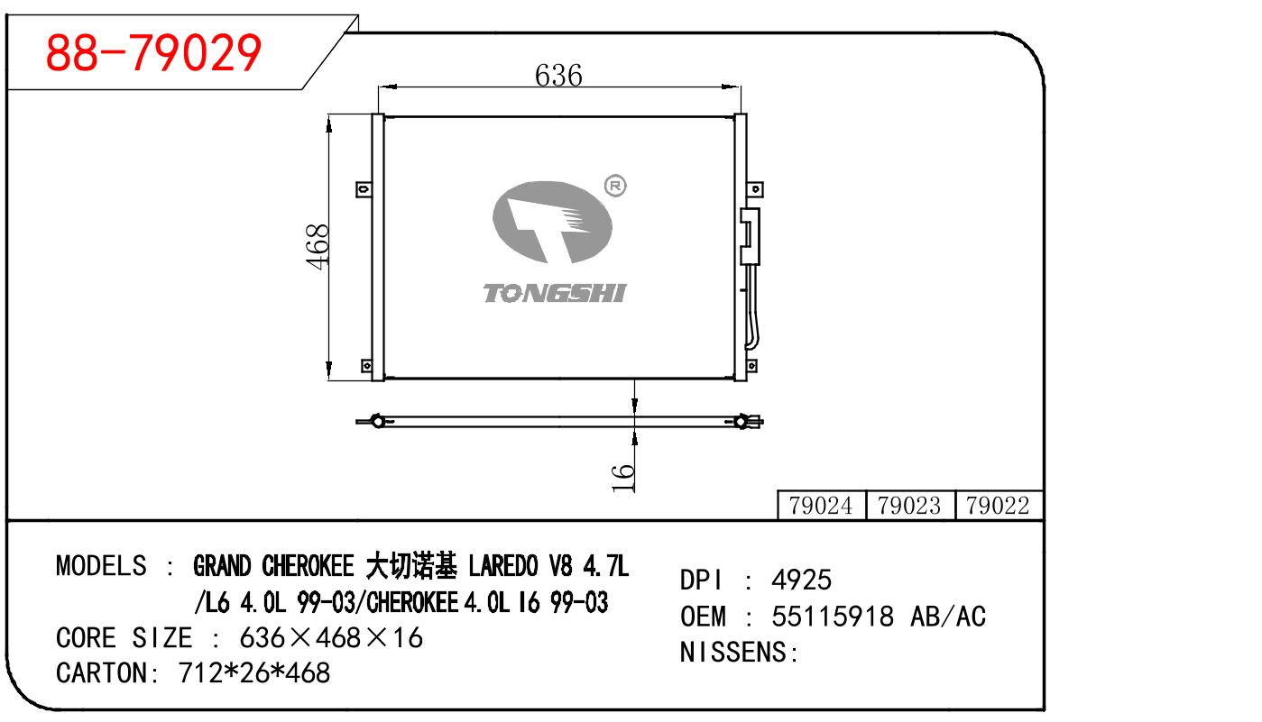 适用于大切洛基LAREDO V8 4.7L/L6 4.0L 99-03/自由光 4.0L 16 99-03冷凝器OEM : 55115918 AB