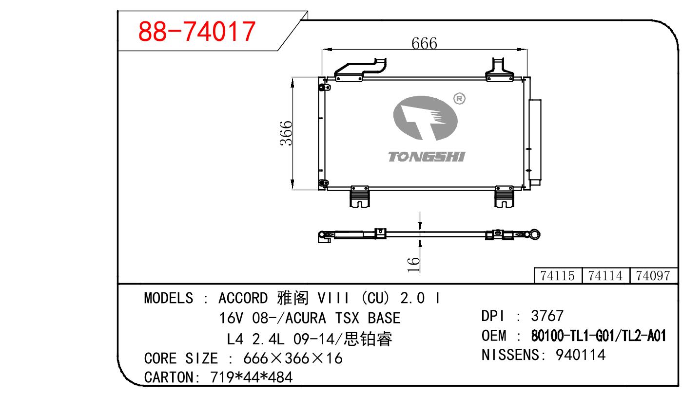 适用于HONDA ACCORD 雅阁 VIII (CU) 2.0 I 16V 08-/ACURA TSX BASE L4 2.4L 09-14 思铂睿 OEM:80100-TL1-G01/80100-TL2-A01/80100TL1G01/80100TL2A01