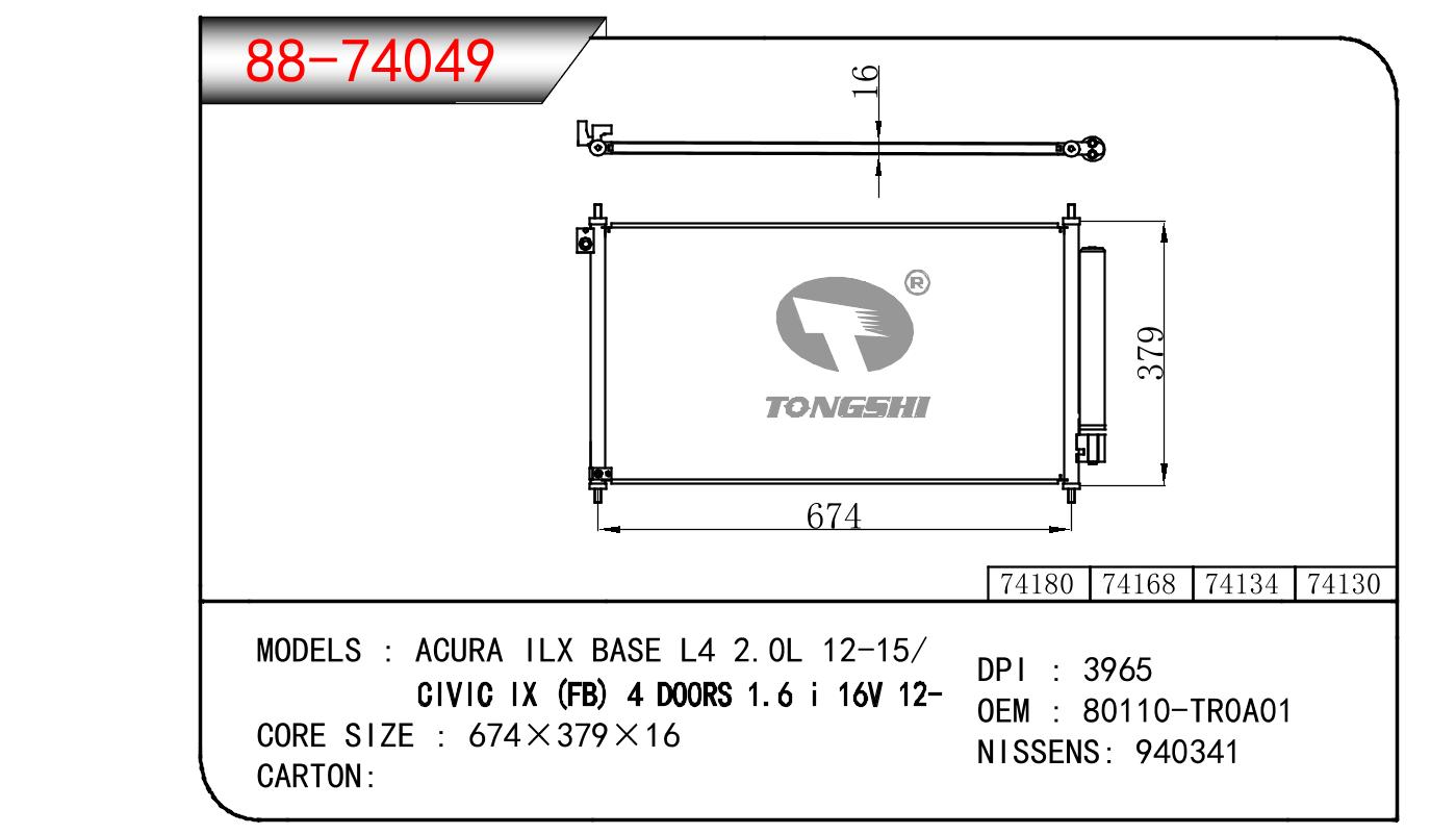 适用于HONDA ACURA ILX BASE L4 2.0L 12-15/CIVIC IX (FB) 4 D00RS 1.6 I 16V 12- OEM:80110-TROA01/80110TR0A01