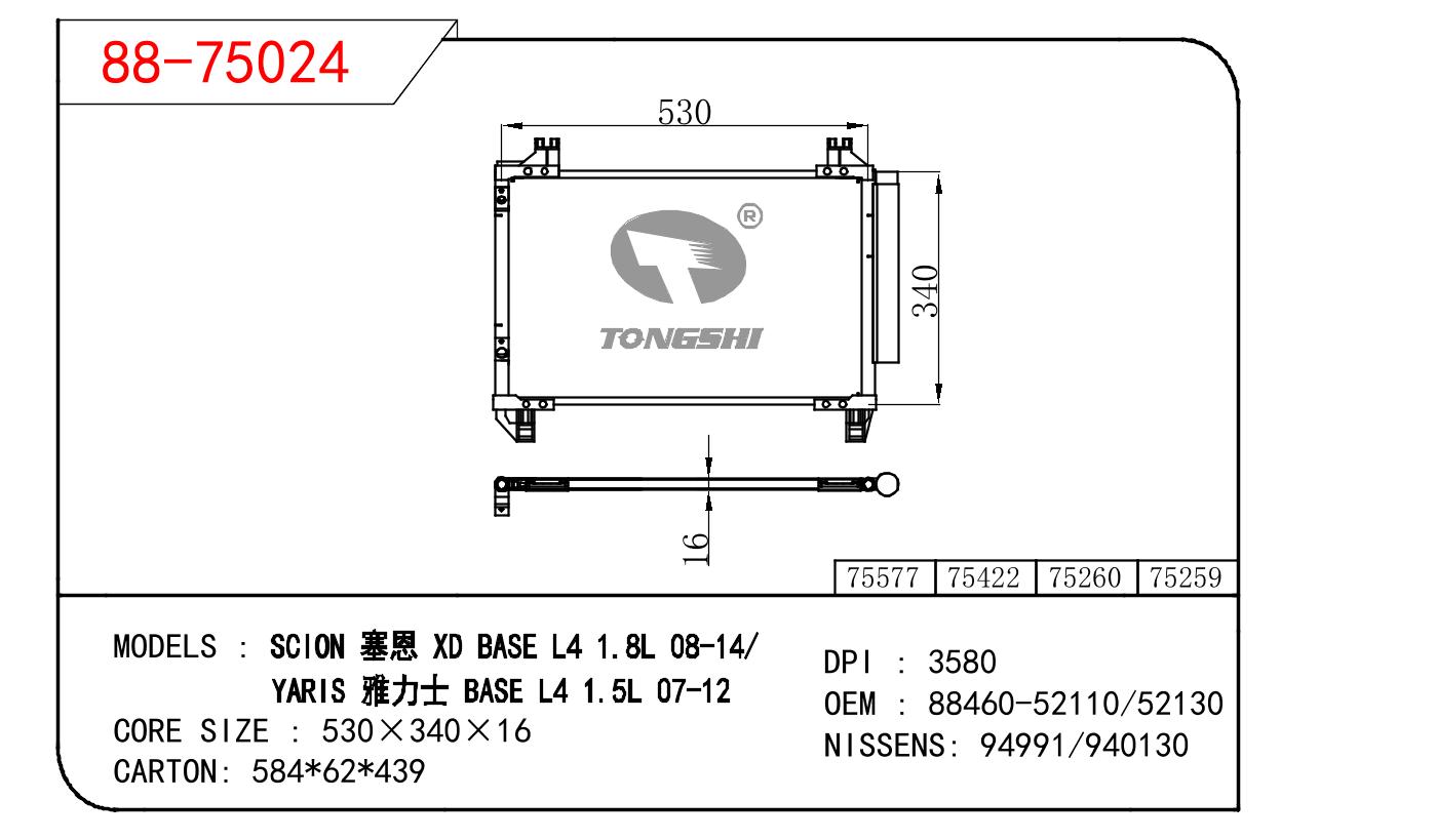 适用于丰田塞恩 XD BASE L4 1.8L 08-14/雅力士 BASE L4 1.5L 07-12冷凝器 OEM : 88460-52110/52130