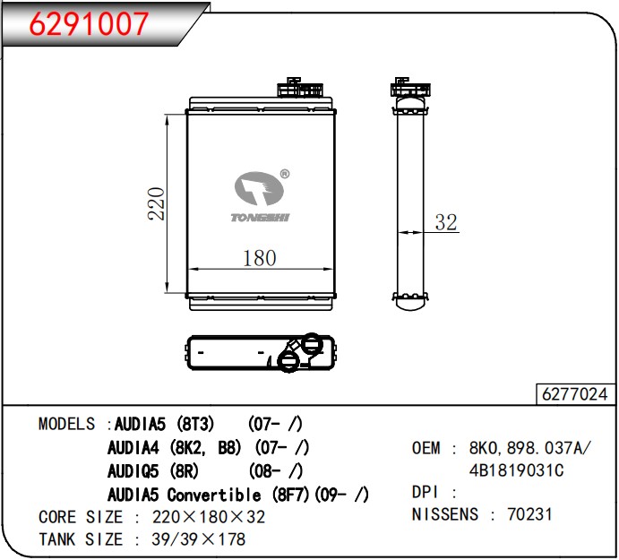适用于奥迪 A5 (BT3) (07-/)奥迪 A4 (8K2 B8)( 07-/)奥迪 Q5 (8R) (08-/)奥迪A5 CONVERTIBKLE (8F7) (09-/)暖风
