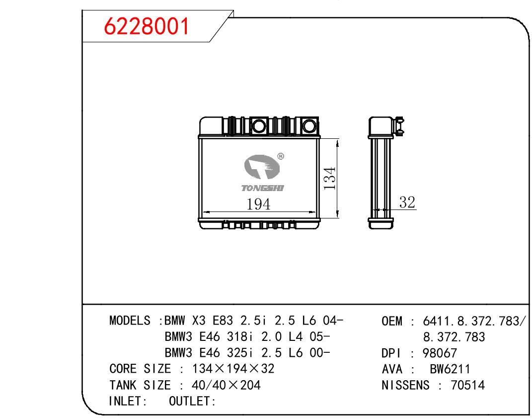 适用于宝马 X3 E83 2.5i 2.5 L6 04-/宝马3 E46 318i 2.0 L4 05-/宝马3 E46 325i 2.5 L6 00- 暖风 OEM : 6411.8.372.783