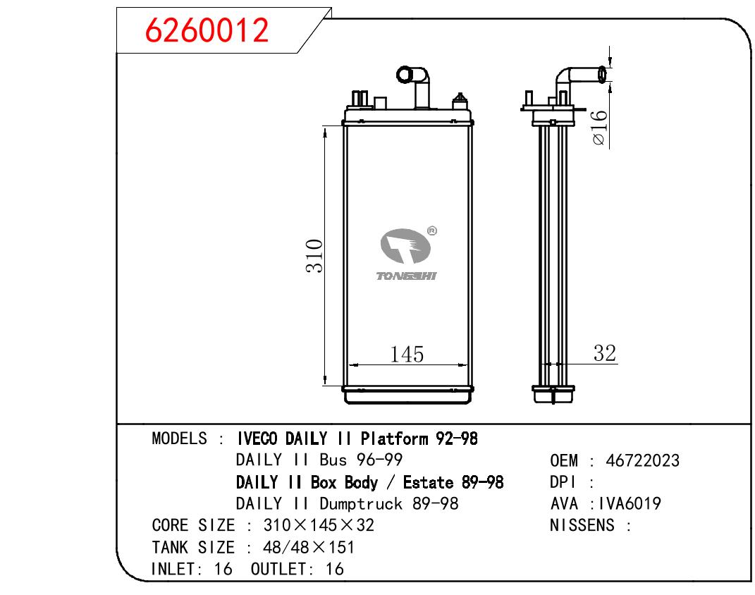 适用于FIAT IVECO DAILY II PLATFORM 92-98/DAILY II BUS 96-99/DAILY II BOX BODY/ESTATE 89-98/DAILY II DUMPTRUCK 89-98 OEM:46722023
