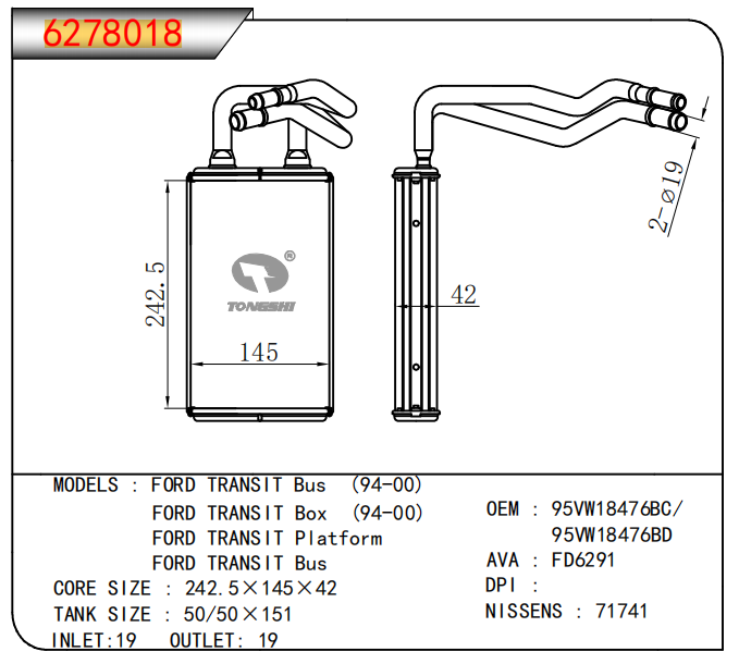 适用于福特捷运巴士(94-00) 福特运输箱(94-00) 福特中转站 福特公共汽车 暖风