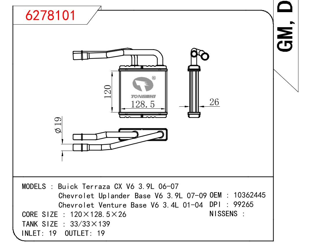 • Buick Terraza CX V6 3.9L 06-07/Chevrolet Uplander Base V6 3.9L 07-09/Chevrolet Venture Base V6 3.4L 01-04