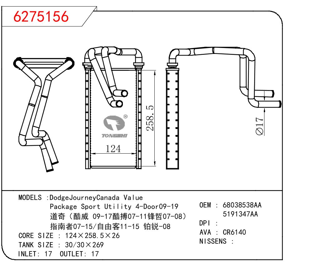 适用于GM DODGE DodgeJourneyCanada Value/Package Sport Utility 4-Door09-19/道奇(酷威 09-17酷搏07-11锋哲07-08)/指南者07-15/自由客11-15 铂锐-08 OEM:68038538AA/5191347AA