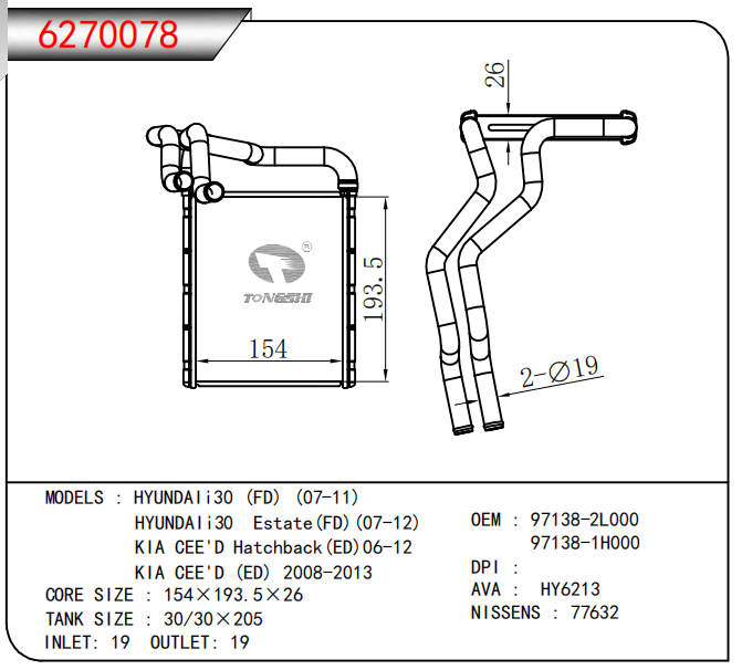 适用于现代i30 (FD) (07-11) 现代i30 Estate(FD)(07-12) 起亚CEE'D掀背车(ED)06-12 起亚汽车(2008-2013)暖风