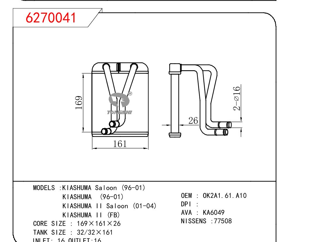 适用于起亚SHUMA Saloon (96-01)/SHUMA (96-01)/SHUMA II Saloon (01-04)/SHUMA II (FB)暖风 OEM : OK2A1.61.A10