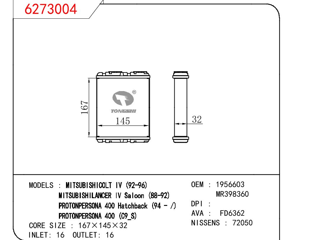 适用于三菱 COLT IV 92-96/三菱LANCER IV SALOON 88-92/PROTONPERSONA 400 HATCHBACK 94-/PROTONPERSONA 400 (C9_S) 暖风 OEM:1956603/MR398360