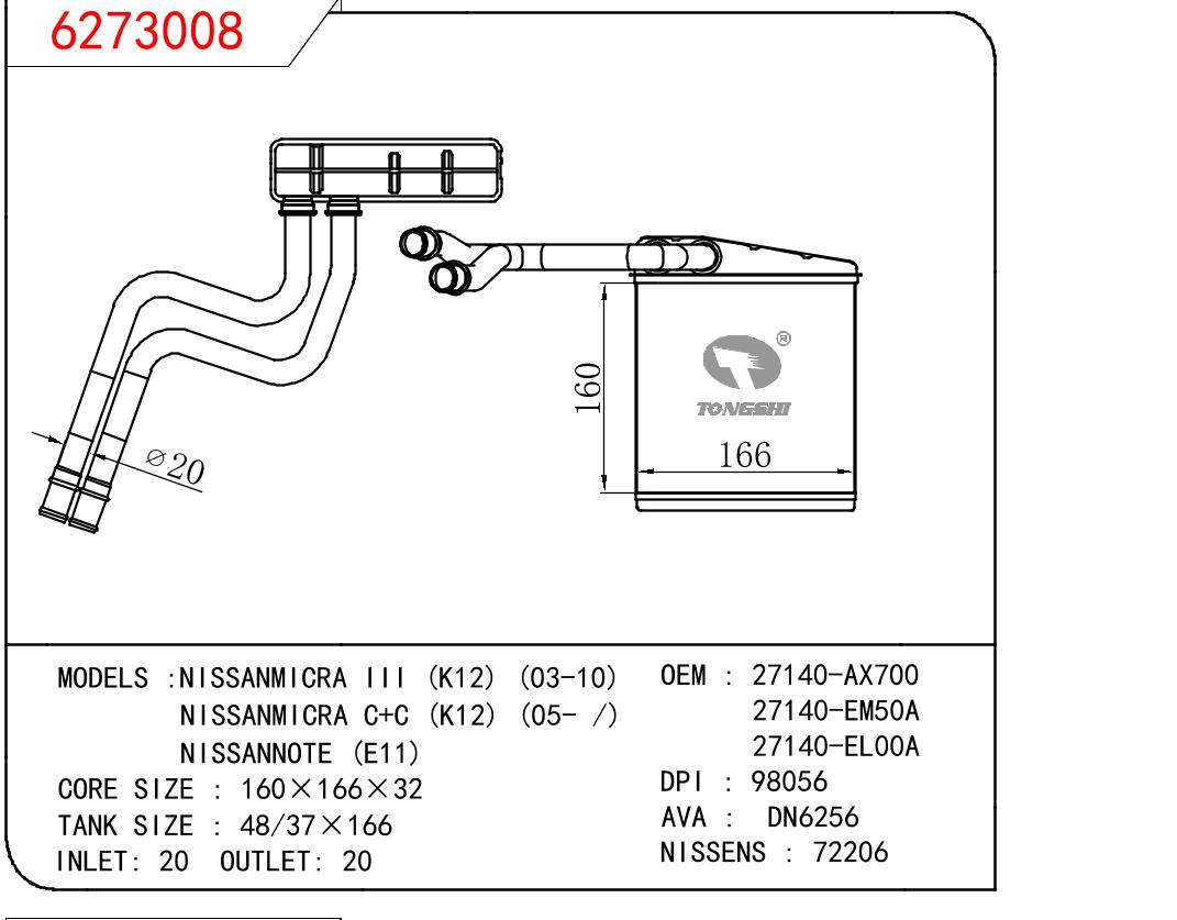 适用于尼桑MICRA III (K12) (03-10)/MICRA C+C (K12) (05- /)/NOTE (E11) 暖风 OEM : 27140-AX700/EM50A/EL00A