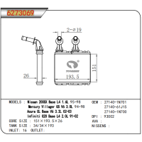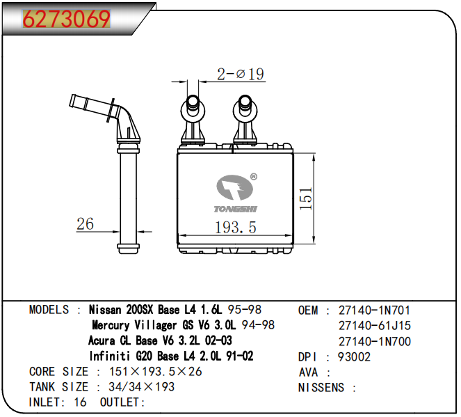 适用于NISSAN 200SX BASE L4 1.6L 95-98/MERCURY VILLAGER GS V6 3.0L 94-98/ACURA CL BASE V6 3.2L 02-03/INFINITI G20 BASE L4 2.0L 91-02 暖风