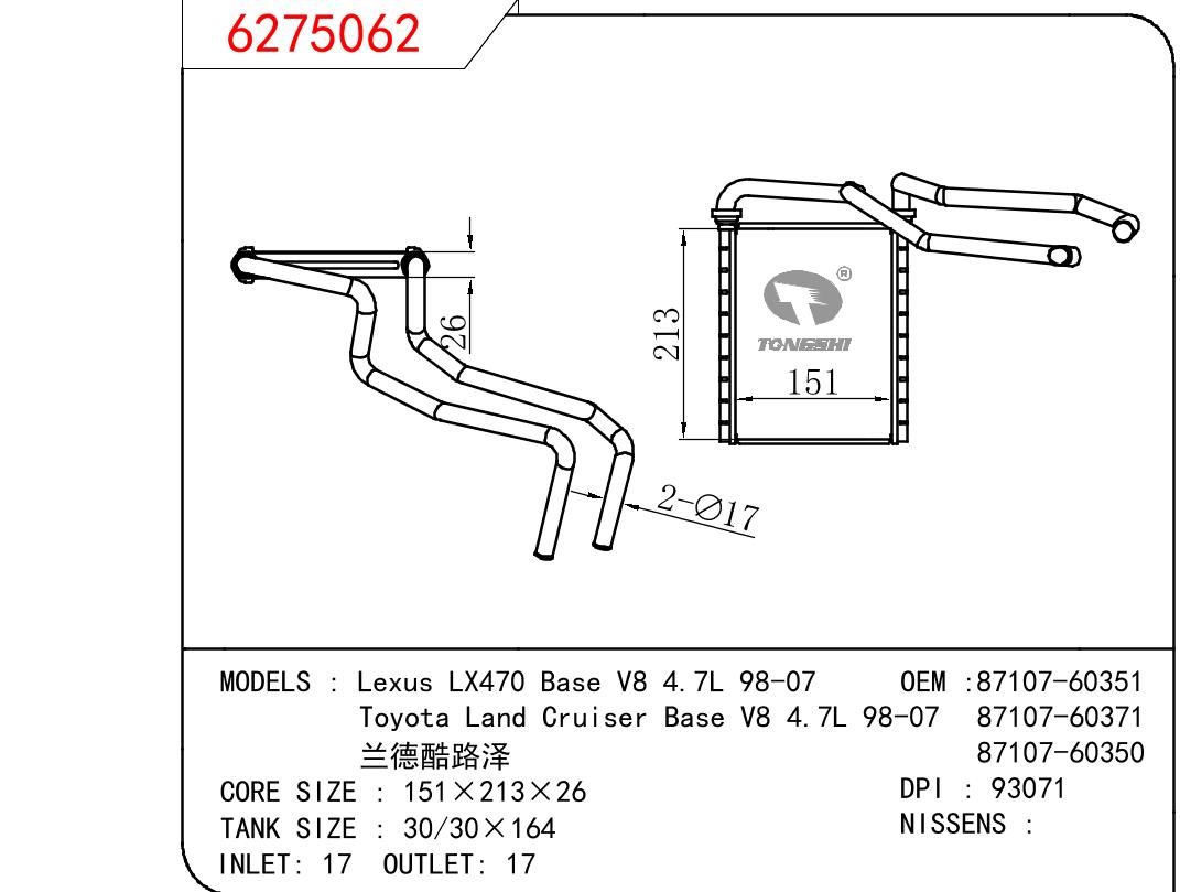 适用于适用丰田雷克萨斯LX470 Base V8 4.7L 98-07/ 兰德酷路泽Base V8 4.7L 98-07暖风 OEM :87107-60351/87107-60371/87107-60350