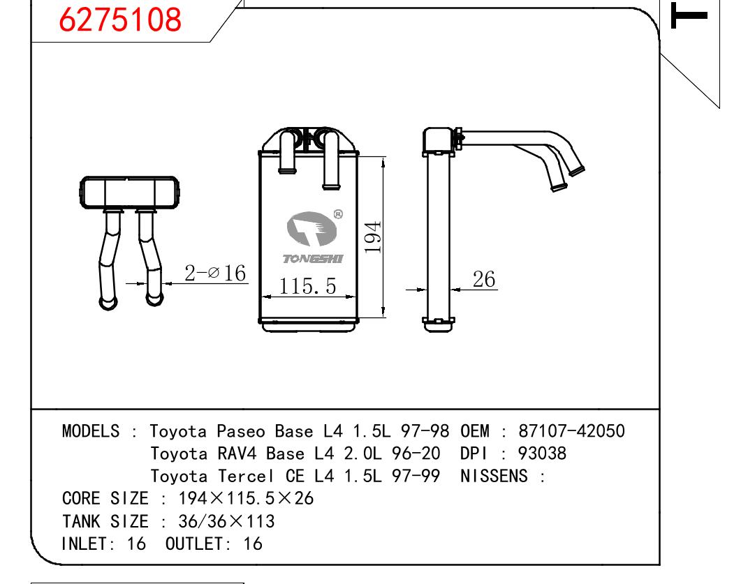 适用于TOYOTA Toyota Paseo Base L4 1.5L 97-98/Toyota RAV4 Base L4 2.0L 96-20/Toyota Tercel CE L4 1.5L 97-99 OEM:87107-42050/8710742050