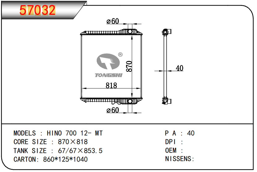 适用于FREIGHTLINER CASCADIA 125/ 113 L6 12.8L 12-13 AT散热器