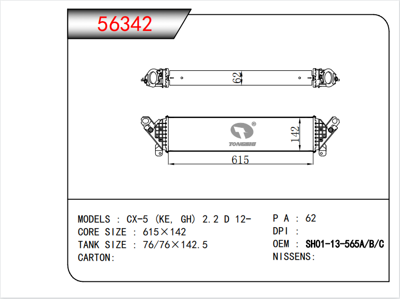 适用于CX-5 (KE, GH) 2.2 D 12-/ 6 Saloon (GJ, GH) 2.2 D 12-13/ATENZA Estate (GJ, GH) 2.2 D 12-/3 (BM) 2.2 D 13-/AXELA Saloon (BM) 2.2 D 13-中冷器