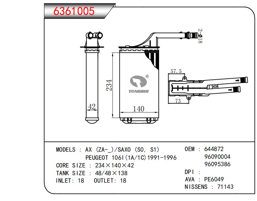 适用于AX (ZA-_)/SAX0 (s0,S1)PEUGEOT 1061(1A/1C) 1991-1996 OEM:644872,96090004,96095386