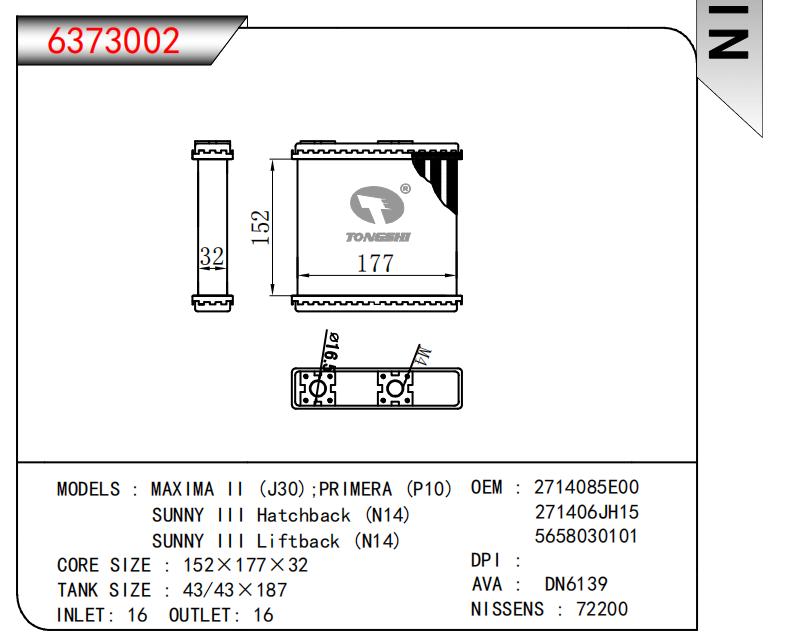 适用于MAXIMA II (J30):PRIMERA (P10)SUNNY III Hatchback (N14)SUNNY IlI Liftback (N14) OEM:2714085E00,271406JH15,5658030101