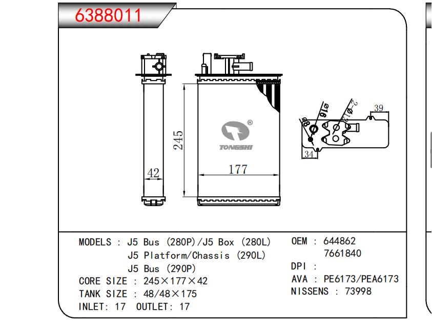 适用于J5 Bus (280P)/J5 Box (280L)J5 Platform/Chassis(290L)J5 Bus (290P) OEM:644862,7661840