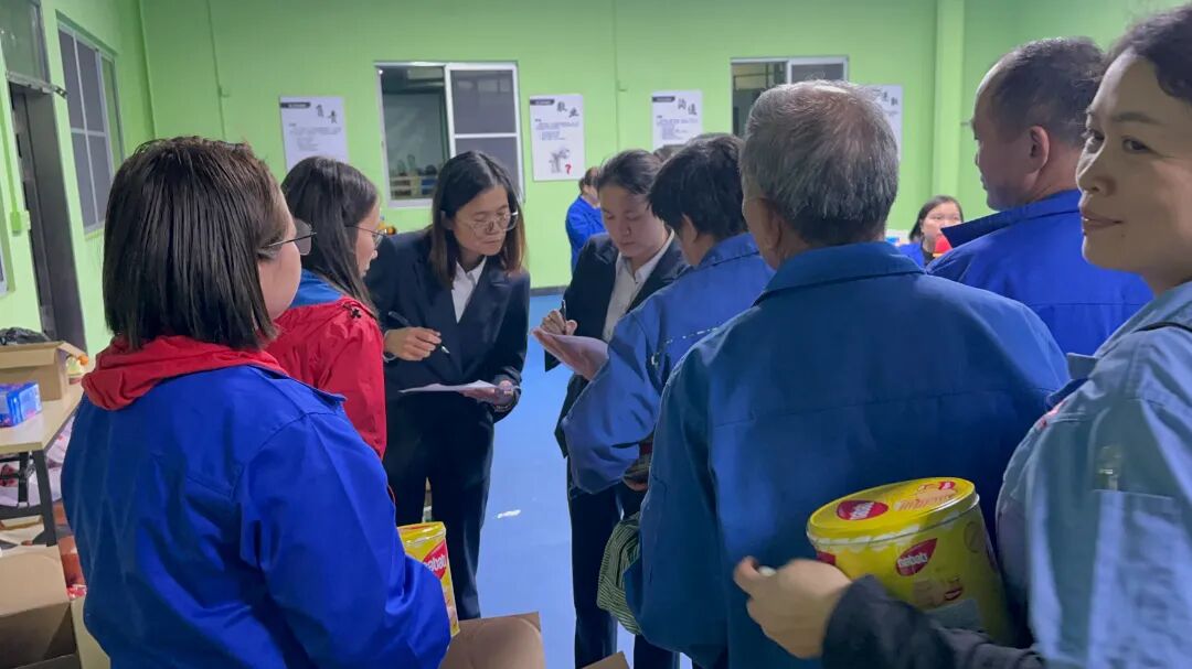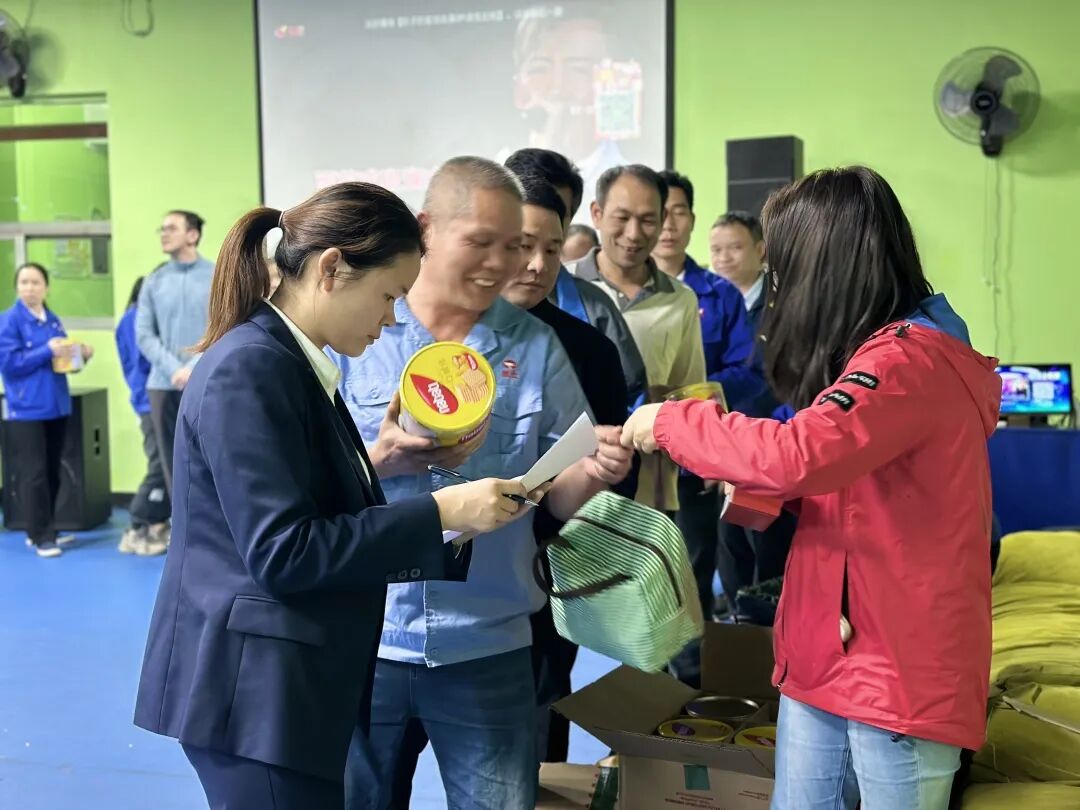 工作人员为寿星们送上本月生日员工的礼物。